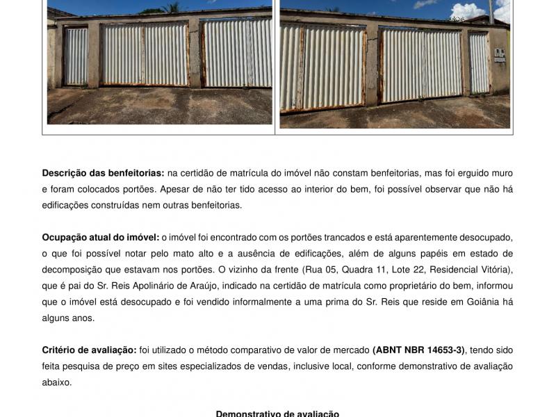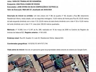 TRIBUNAL REGIONAL DO TRABALHO DA 18ª REGIÃO - GOIÁS VARA DO TRABALHO DE GOIANÉSIA- GO Av. Contorno, 7187, Esquina com a Rua Andorinha, Setor Universitário, Goianésia - GO - CEP: 76382-003 EDITAL DE PRAÇA, LEILÃO E INTIMAÇÃO ATOrd 0010709-61.2023.5.18.0261 AUTOR: ANA PAULA GAMA DE SOUSA RÉU: JANE DIVINA DA SILVA CONFECÇÕES E OUTROS (3) O(A) Juiz(íza) do Trabalho da VARA DO TRABALHO DE GOIANÉSIA, que abaixo subscreve, no uso das atribuições que lhe confere a Lei, FAZ SABER a quantos virem o presente EDITAL, ou dele tiverem conhecimento, que, por intermédio deste, tomem conhecimento da realização de leilão público, por meio eletrônico, nos termos dos Artigos 879 ao 903 do Código de Processo Civil, Lei nº 13.105, de 16 de Março de 2015, e Resolução Nº 236 de 13/07/2016 do Conselho Nacional de Justiça, Provimento do TRT 18ª SCR Nº 2/2022 e demais cominações legais, conforme abaixo: Nome do Leiloeiro: VALDIVINO FERNANDES DE FREITAS, Registro na JUCEG/GO nº 011, LEILÕES ANÁPOLIS LTDA, wwww.leiloesanapolis.com.br, contatos: leiloeiro.valdivino@gmail.com, contato@leiloesanápolis.com.br, telefone: 62- 3315/2098/9.9650-2098/9.9288-8042, Endereço: Rua Dona Ada Centine, Qd. 20, Lt. 25, número 307, Bairro Maracanâ, Anápolis/GO. Data e horários do encerramento do primeiro leilão (proposta por valor não inferior ao da avaliação): 16/12/2025, às 13:00h. Data e horários do encerramento do segundo leilão (proposta por valor não inferior ao lance mínimo), pré-estabelecido neste edital: 16/12/2025, às 14:00h. Descrição dos bens: Um lote urbano de nº 24, da quadra nº 12, situado a Rua 05, loteamento Residencial Vitoria, nesta cidade, com as seguintes metragens: 10,00 metros de frente para Rua 05; 25,00 metros do lado esquerdo dividindo com o lote nº 23; 25,00 metros do lado direito dividindo com o lote nº 25 e 10,00 metros de fundo dividindo com o lote nº 31; área total: 250,00 metros quadrados. Matrícula: nº 10.580, livro nº 2-AP, às fls. 289, realizada em 16 de março de 2009 no Cartório de Registro de Imóveis de Itaberaí/GO. Proprietário constante da Matrícula: REIS APOLINÁRIO DE ARAÚJO e sua esposa JANE DIVINA DA SILVA ARAÚJO, conforme R-2-10.580. TOTAL DA AVALIAÇÃO R$110.000,00 (cento e dez mil reais). Auto de avaliação de ID. Número 0e51dd5. Valor do lance mínimo no primeiro leilão, avista ou parcelado: R$110.000,00. Valor do lance mínimo no segundo leilão avista: R$55.000,00. Valor do lance mínimo no segundo leilão parcelado: R$77.000,00. Sítio eletrônico do Leilão: wwww.leiloesanapolis.com.br. Valor da execução: R$ 54.987,07, ATUALIZADA ATÉ 28/05/2024, incluídas as custas de diligência do Oficial de Justiça. Constam na matrícula as seguintes restrições: 1) – R-03-10.580 – Alienação Fiduciária em favor do Banco do Brasil; 2) – R-04-10.580 – Penhora no processo: 5299629-71.2021.8.09.0079, promovida por THIAGO PALMEIRA DE ANDRADE QUEIROZ; INDISPONIBILIDADES: 3) – AV-08-10.580 - Vara do Trabalho de Rio Verde-GO, processo n° 00105418820225180101; 4) - AV-09-10.580 - Vara do Trabalho de Goiás-GO, conforme processo nº 00114038720225180221; 5) – AV-10-10.580 - Vara do Trabalho de Goiás-GO, processo nº 00106079620225180221; 6) – AV-11-10.580 - Vara do Trabalho de Goiás-GO, conforme processo nº 00104915620235180221; 7) – AV-12-10.580 - Vara do Trabalho de Gurupi-TO, conforme processo nº 00006353620235100821; 8) – AV-13-10.580 e AV-14-10.580 – Indisponibilidades destes autos; Quem pretender arrematar, adjudicar, ou remir dito(s) bem(s), deverá estar ciente de que à espécie aplicam-se os preceitos da Consolidação das Leis do Trabalho, da lei nº 5.584, de 26.06.1970, da lei 6.830, de 22.09.1980 e do Código de Processo Civil, observada a ordem de citação, a omissão e a compatibilidade, principalmente dos dois últimos institutos. Havendo penhora do bem em outro processo, será observada a ordem das respectivas prelações ou penhoras, sendo que, em caso de arrematação, perderá efeito as demais penhoras, passando os credores concorrerem apenas ao produto da expropriação. Fica o arrematante/alienante isento dos créditos tributários relativos a impostos cujo fato gerador seja a propriedade, o domínio útil ou a posse de bens imóveis, e bem assim os relativos a taxas pela prestação de serviços referentes a tais bens, ou a contribuições de melhoria da União, Estados, Município e Distrito Federal, salvo quando conste do título a prova de sua quitação, seja em hasta pública ou alienação particular, estejam ou não inscritos na dívida ativa (art. 130, parágrafo único do CTN). Considerando a natureza do bem penhorado e o valor da avaliação (R$110.000,00), será admitida proposta de aquisição em prestações na forma do art. 895 do CPC, observada o seguinte: até o início do 1º leilão, proposta por valor não inferior ao da avaliação; até o início do 2º leilão, proposta por valor não inferior a 70% da avaliação; entrada de 25% do valor do lance à vista e o restante parcelado em até 12 (doze) meses, corrigidos pelo IPCA-E, mediante depósitos judiciais. A apresentação de proposta de aquisição em prestações não suspende o leilão. A proposta de pagamento do lance à vista prevalecerá sobre as propostas de pagamento parcelado, desde que de igual ou maior valor. Caução, no caso de imóvel o próprio bem arrematado ficará HIPOTECADO garantindo o pagamento do Parcelamento, artigo 895 do CPC. Caução para bens não imóveis: será garantida através de Caução idônea (exemplo de caução idônea: Seguro garantia, fiança bancária, imóvel em nome do arrematante ou de terceiro, com valor declarado igual ou superior a 03 (três) vezes o valor da arrematação), caução está condicionada à aceitação e homologação pelo o juízo. Não sendo apresentada caução idônea, ou, não sendo a caução apresentada aceita pelo o juízo, a expedi